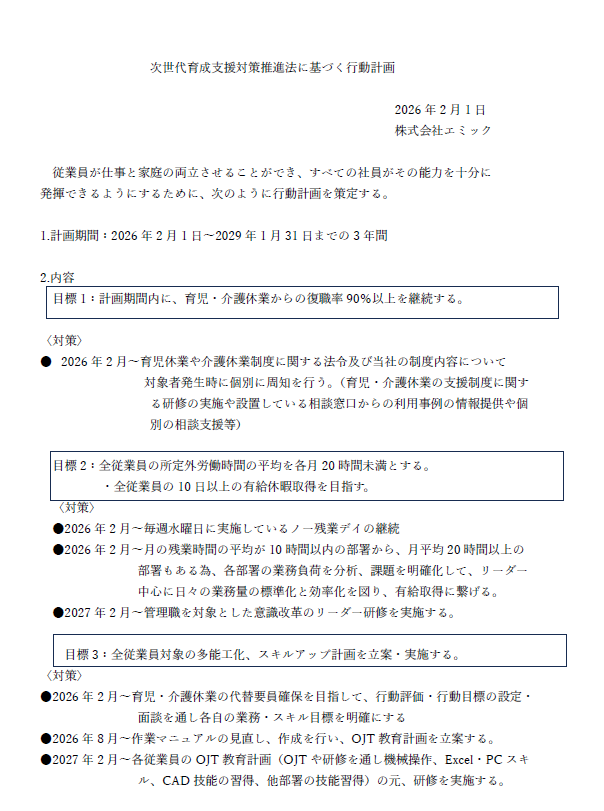この度、弊社では「次世代育成支援対策推進法」に基づき、「一般事業主行動計画」を策定いたしました。
